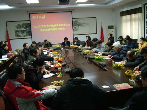 2012年新年伊始,我校党委在花溪北校区行政楼第一会议室隆重召开了“2012年学校统战各界代表人士情况通报暨迎春座谈会”。出席会议的校领导有:校党委副书记、校长陈叔平、校党委副书记任钢建、校纪委书记杨伟民、副校长金道超。学校各民主党派省委副主委及各基层组织的主要负责人,各级人大代表、政协委员,少数民族人士代表,校留联、侨联主要负责人,省、市人民政府参事,无党派人士代表和校党委统战部负责人及相关工作人员参加了会议。会议由任钢建副书记主持。
