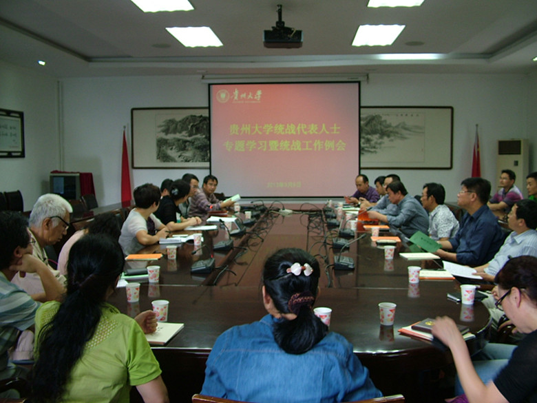新学期伊始,贵州大学党委统战部在北校区行政楼第一会议室召开贵州大学统战各界代表人士专题学习会,传达学习陈敏尔省长与省政协委员座谈时的讲话精神和新学期学校工作大会上党委书记姚小泉、校长郑强的讲话精神,学校各民主党派省委副主委、各基层组织的主要负责人、各级人大代表、政协委员、校知联会、留学人员联谊会、侨联主要负责人参加了专题学习。通过传达学习陈敏尔省长与省政协委员座谈时的讲话精神,党外代表人士表示,要进一步加强调研和学习,切实提高参政议政的能力和水平,充分发挥高校教育工作者的作用,进一步增强责任感和使命感,为推动全省中、高级职业教育的发展做出应有的贡献。