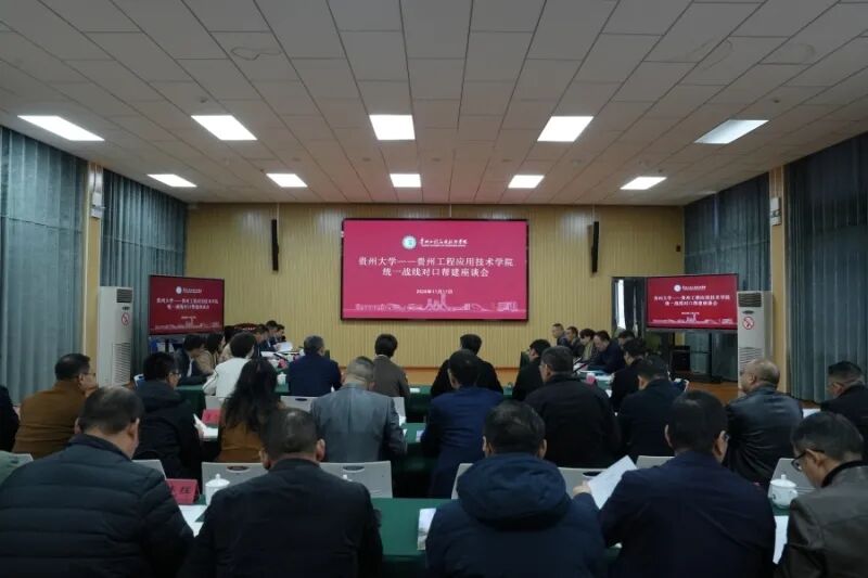 11月17日,贵州大学-贵州工程应用技术学院统一战线对口帮建座谈会在贵州工程应用技术学院召开。贵州大学党委书记杨未、副校长陈祥盛,贵州工程应用技术学院党委书记熊星、校长张嗣杰等校领导以及两校有关单位负责同志参加会议。